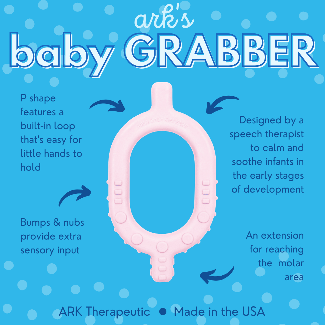 O novo Baby Grabber® da ARK foi desenvolvido para ajudar pais e terapeutas a auxiliar bebés nos estágios iniciais do desenvolvimento oral. Use-o para incentivar a exploração sensorial e as habilidades de morder e mastigar. Esta atividade motora oral pode ajudar a fortalecer os músculos da boca e prepará-los para habilidades de fala e alimentação mais tarde.