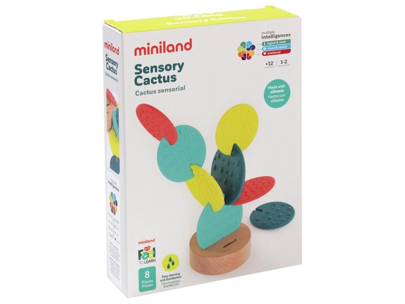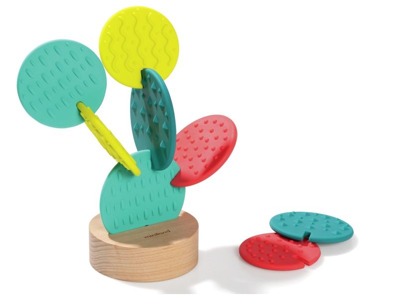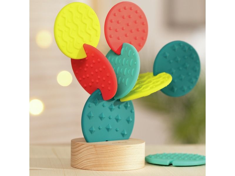 Brinquedo sensorial em forma de cato com 8 peças flexíveis de diferentes texturas e cores para criar estruturas.
