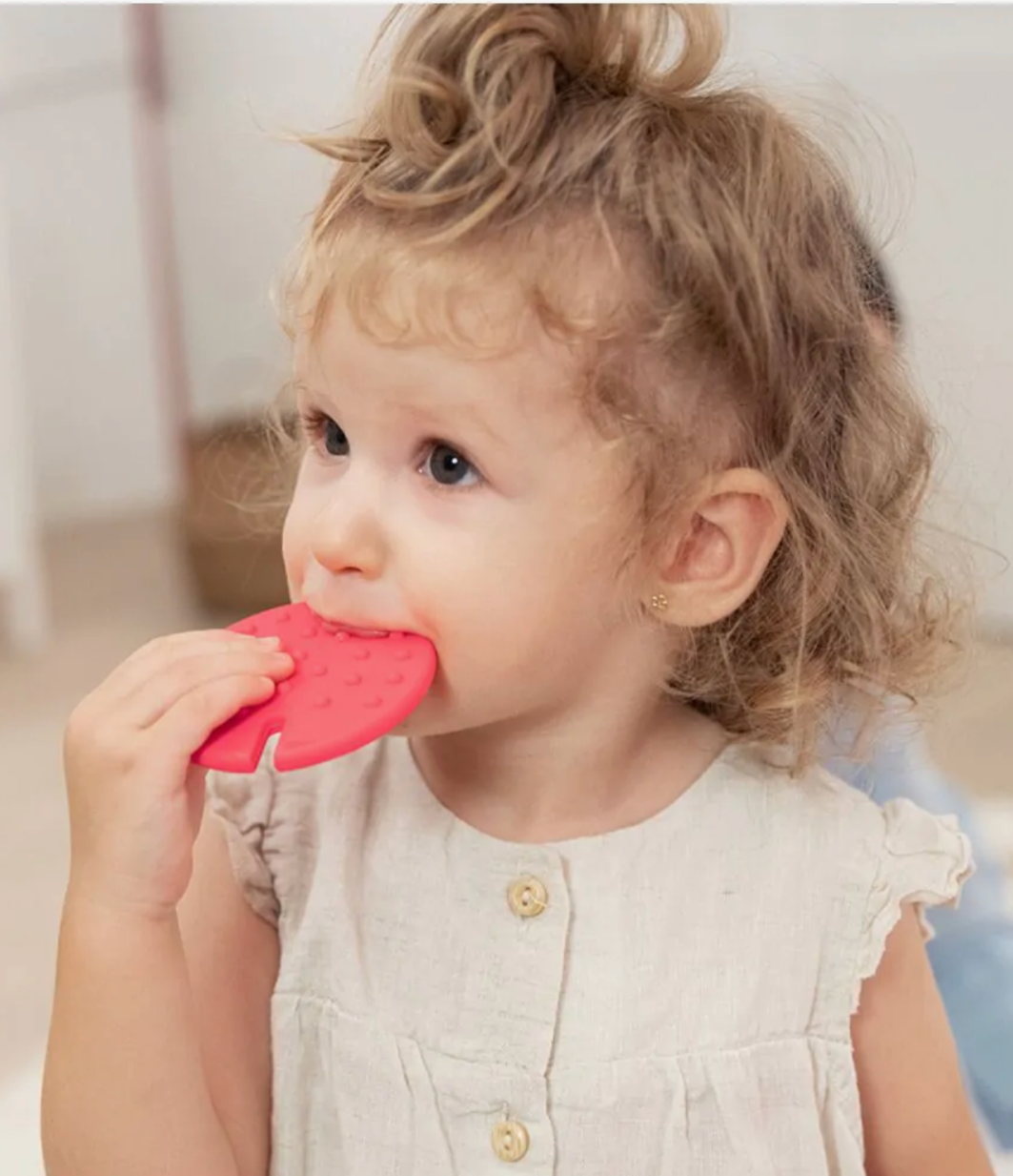 Peças de silicone e base de madeira seguras para as mordidelas dos mais pequeninos.