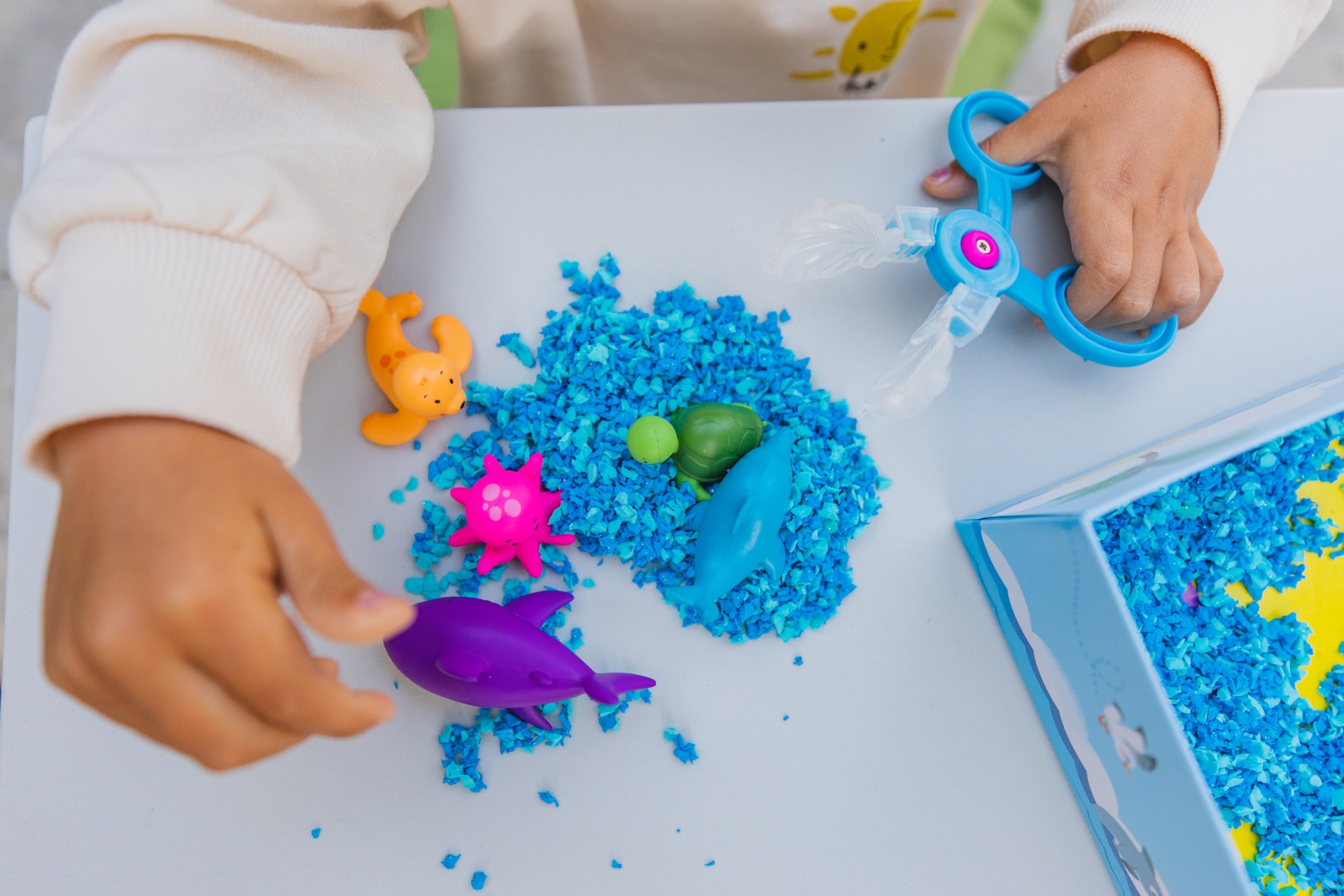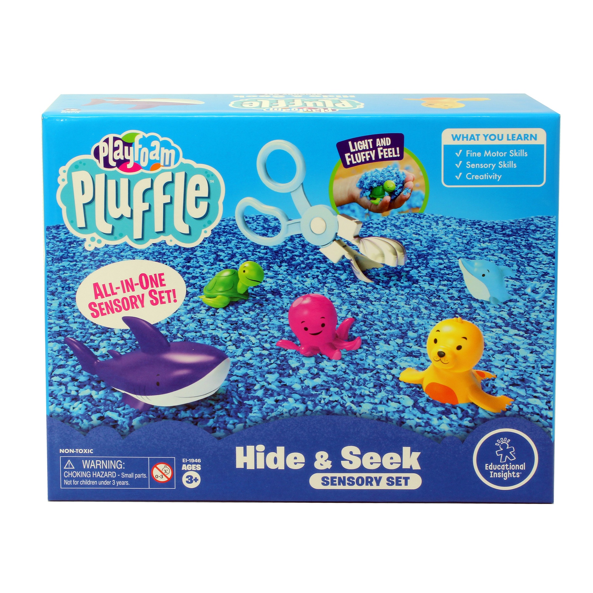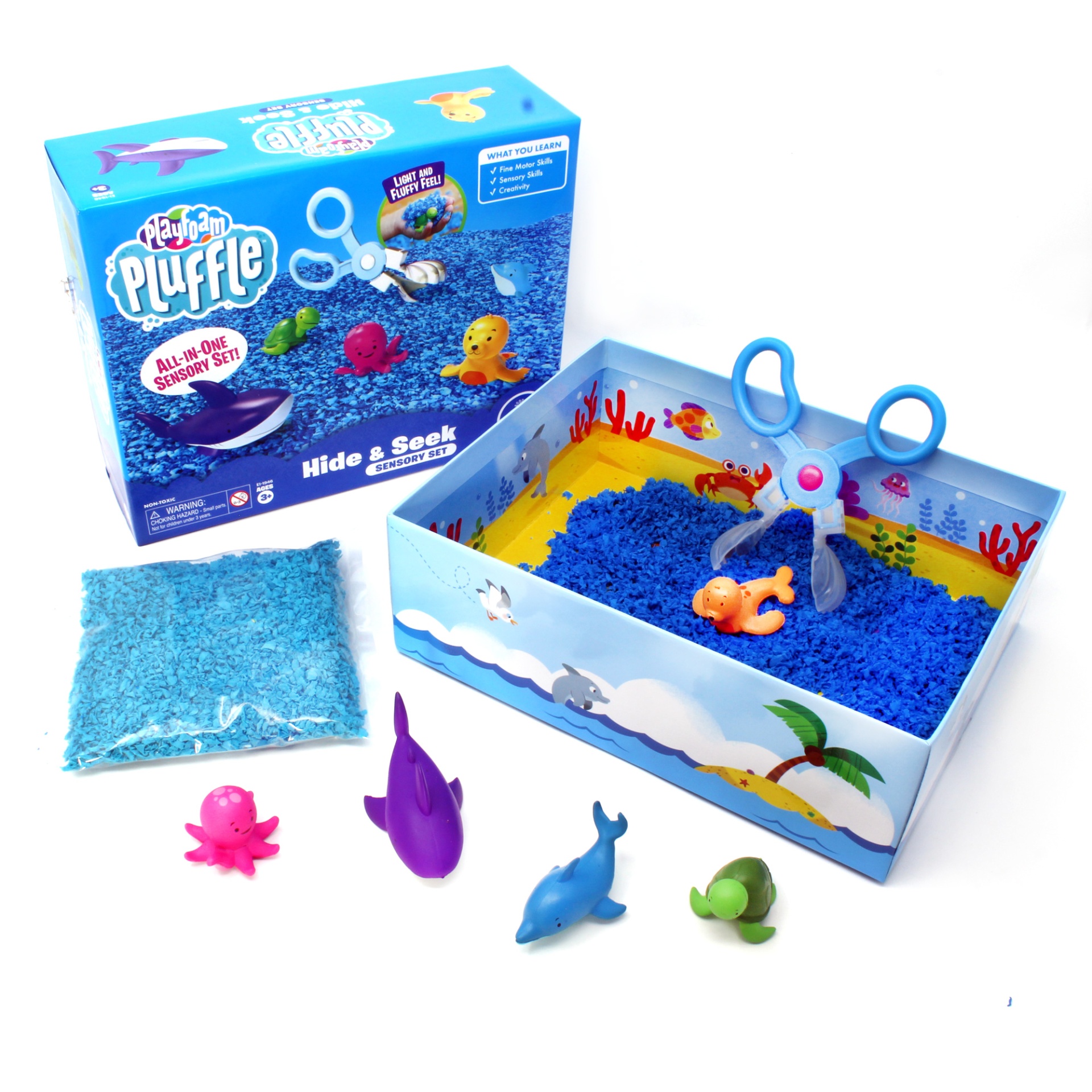 Mergulhe na diversão sensorial com este conjunto sensorial Playfoam Pluffle™ perfeito para brincadeiras sensoriais em ambientes interiores ou em espaços pequenos. Vem com 2 cores do premiado Playfoam Pluffle (granulado com alguma capacidade moldável), colheres tipo tesoura, um prático rolo, copo de recolha e 5 animais marinhos. À medida que as crianças pegam, peneiram, despejam, espremem e brincam com o Playfoam Pluffle, desenvolvem as capacidades motoras finas através de brincadeiras divertidas. O Playfoam Pluffle nunca seca, por isso a diversão sensorial nunca acaba!